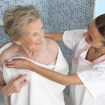 - Pflegebedürftigen je nach Bedarf unterstützen (z. B. beim Wasserstrahl einstellen, beim Waschen von nicht erreichbaren Körperstellen, bei der Haarwäsche, beim Abtrocknen usw.)