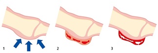 Durch die Neuropathie verändern sich Fußstatik und -motorik, weshalb beim Gehen und Stehen ein erhöhter Druck auf die Fußsohle einwirkt [1]. Dieser führt zur verstärkten Hornhaut und Schwielenbildung, wodurch die Druckkräfte in tiefere Gewebeschichten weitergeleitet werden. Gleichzeitig kommt es zur Ablösung der Haut, zu Einrissen, Einblutungen und kleinen Hämatomen, die im weiteren Verlauf mit Bakterien besiedelt werden [2]. In Folge entsteht daraus eine infizierte, geschwürige Wunde, das „Malum perforans“ [3]. Seine medizinische Bezeichnung rührt daher, dass die Wunde oft wie „ausgestanzt“ aussieht.