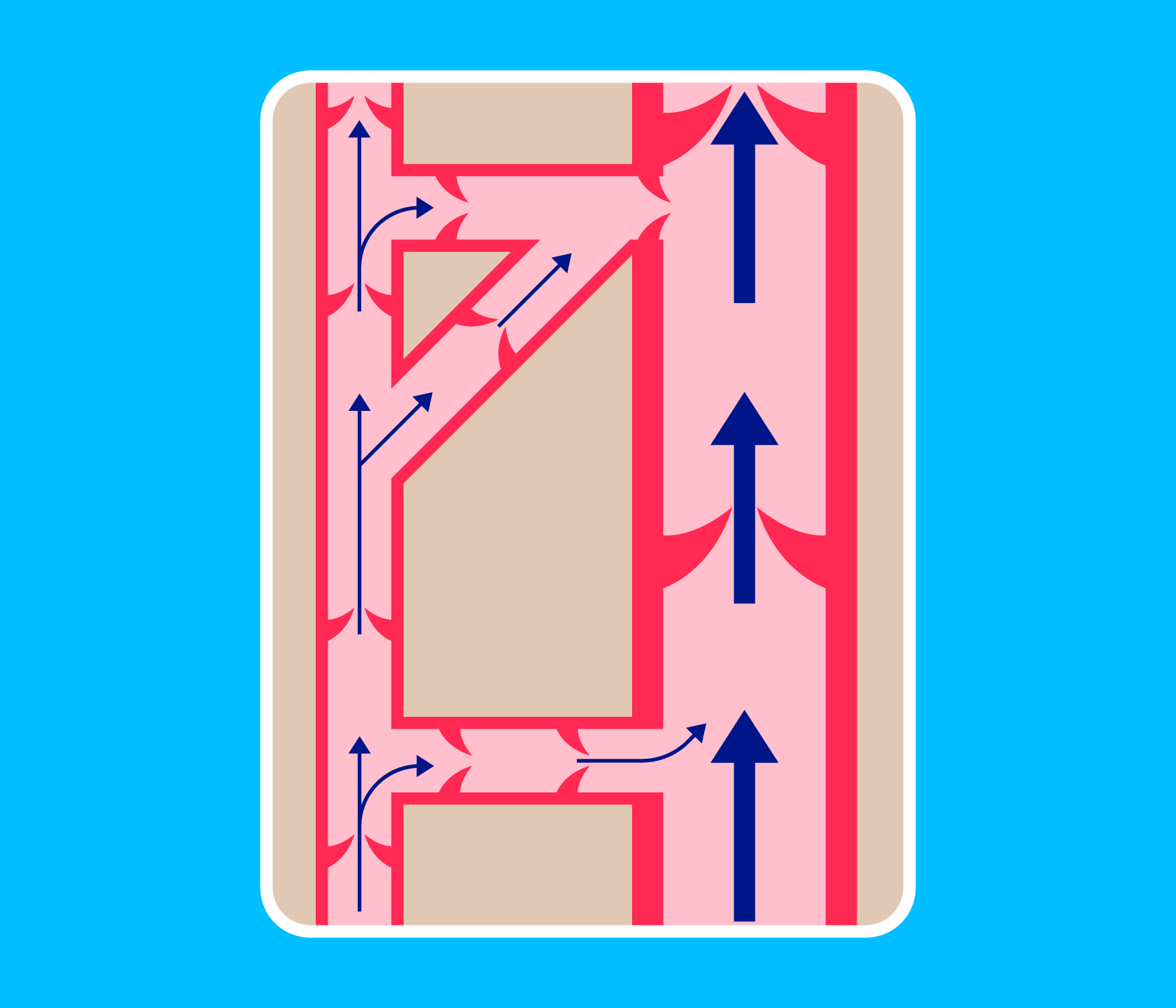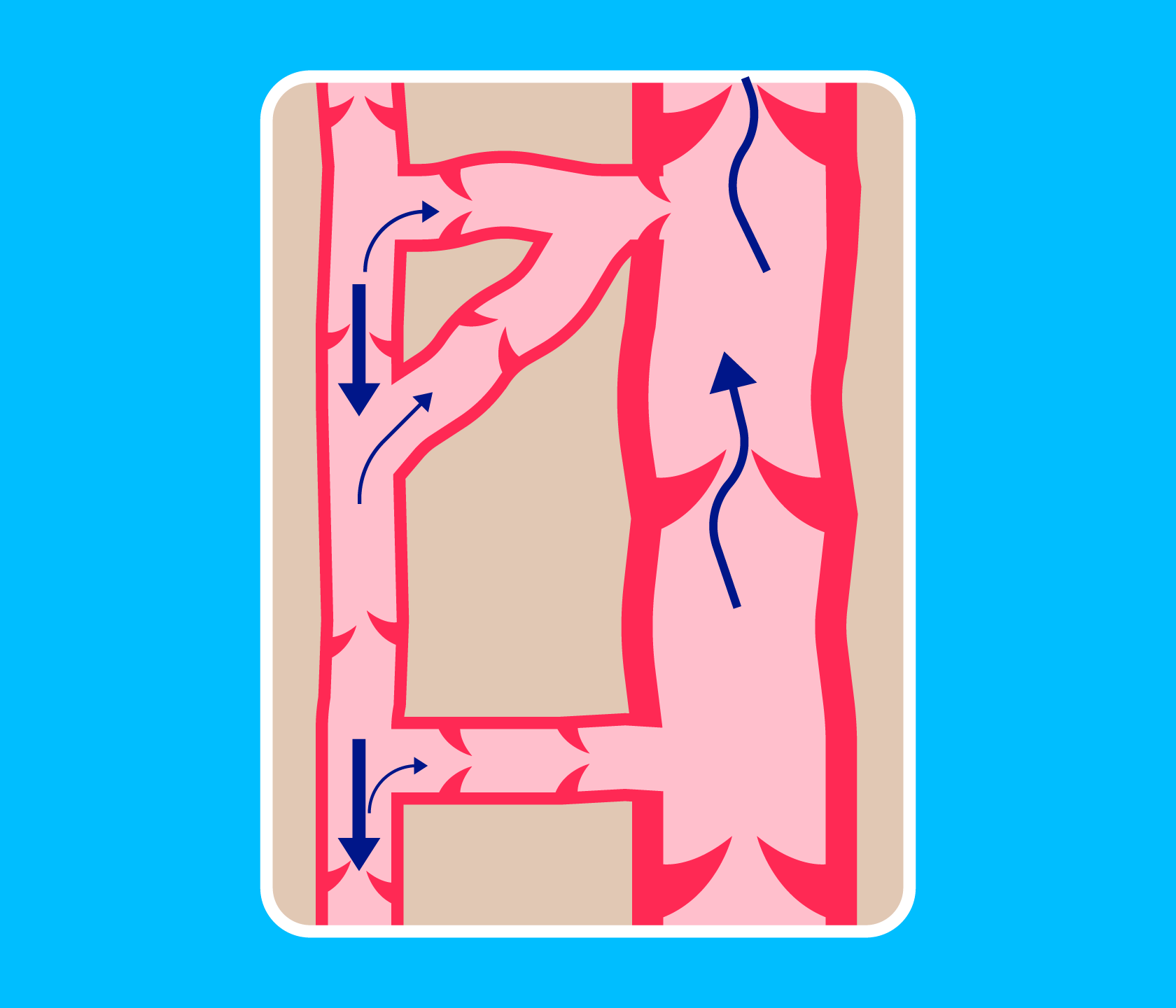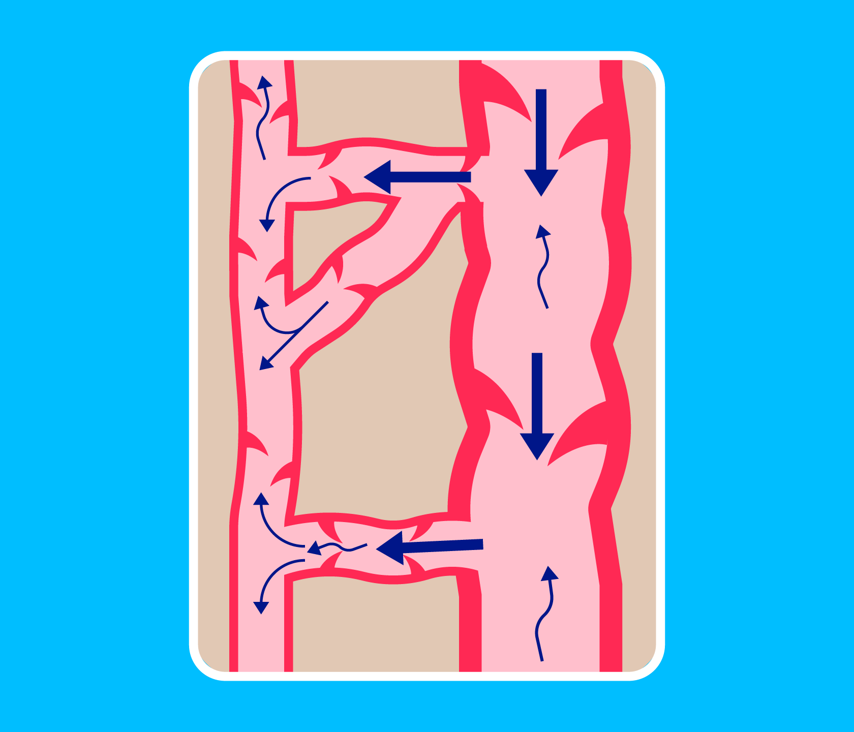 Um diese Aufgabe trotzdem zu bewältigen, verfügen alle Venen über „Venenklappen“, die wie Ventile funktionieren und dafür sorgen, dass das Blut nur in eine Richtung, nämlich herzwärts fließen kann. Die Grafik zeigt einegesunde Vene [A], eine offene Venenklappe [B] und eine geschlossene Venenklappe [C]. Durch das Zusammenspiel von geschlossenen und offenen Venenklappen wird ein Zurücksacken des Blutes verhindert. Dabei erhalten die Venenklappen Unterstützung durch die „Wadenmuskelpumpe“. Bei Bewegung spannt und entspannt sich die Wadenmuskulatur in einem rhythmischen Wechsel, wodurch auch die Venen zusammengepresst werden und das Blut nach oben – herzwärts – gedrückt wird.
